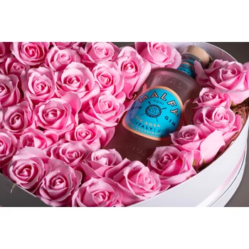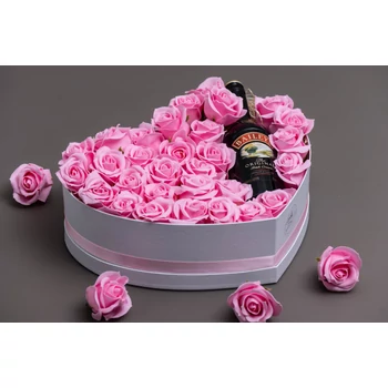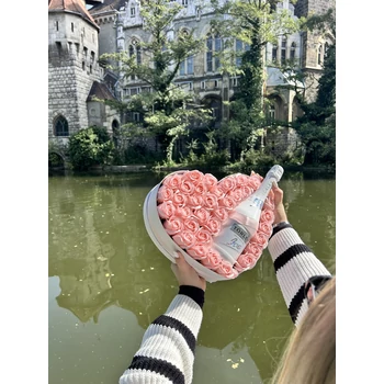 Fehér szív alakú doboz, rózsaszín szappanrózsával és választható itallal. Kérhető bele tartósított örökrózsa is, ezt kérjük jelezd nekünk a megrendelés előtt és kalkulálunk rá árat. Az italok között megtalálható alkoholos és alkoholmentes verzió is. A dobozt rózsaszín szatén szalaggal kötjük át és nagyobb italoknál az italt és rögzítjük ezzel. |